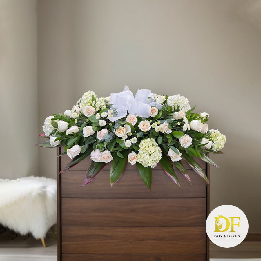 Este diseño floral transmite serenidad y profundidad emocional a través de 6 hortensias blancas, símbolo de gratitud y unidad, acompañadas de 48 rosas blancas, representación de amor eterno y pureza espiritual. Cada flor ha sido cuidadosamente dispuesta para cubrir completamente la caja, logrando una presentación impecable, armoniosa y llena de paz.