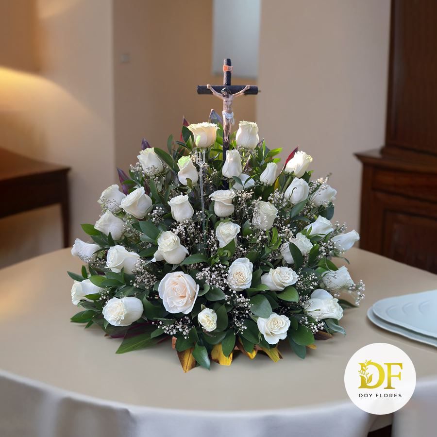 Un arreglo floral que transmite respeto, pureza y serenidad. Con 36 rosas que evocan recuerdos llenos de amor y significado, acompañadas por gipsofila que aportan elegancia y tranquilidad, este diseño se completa con un Cristo que lleva el ramo. Ideal para expresar sentimientos profundos y acompañar con delicadeza momentos especiales de homenaje.