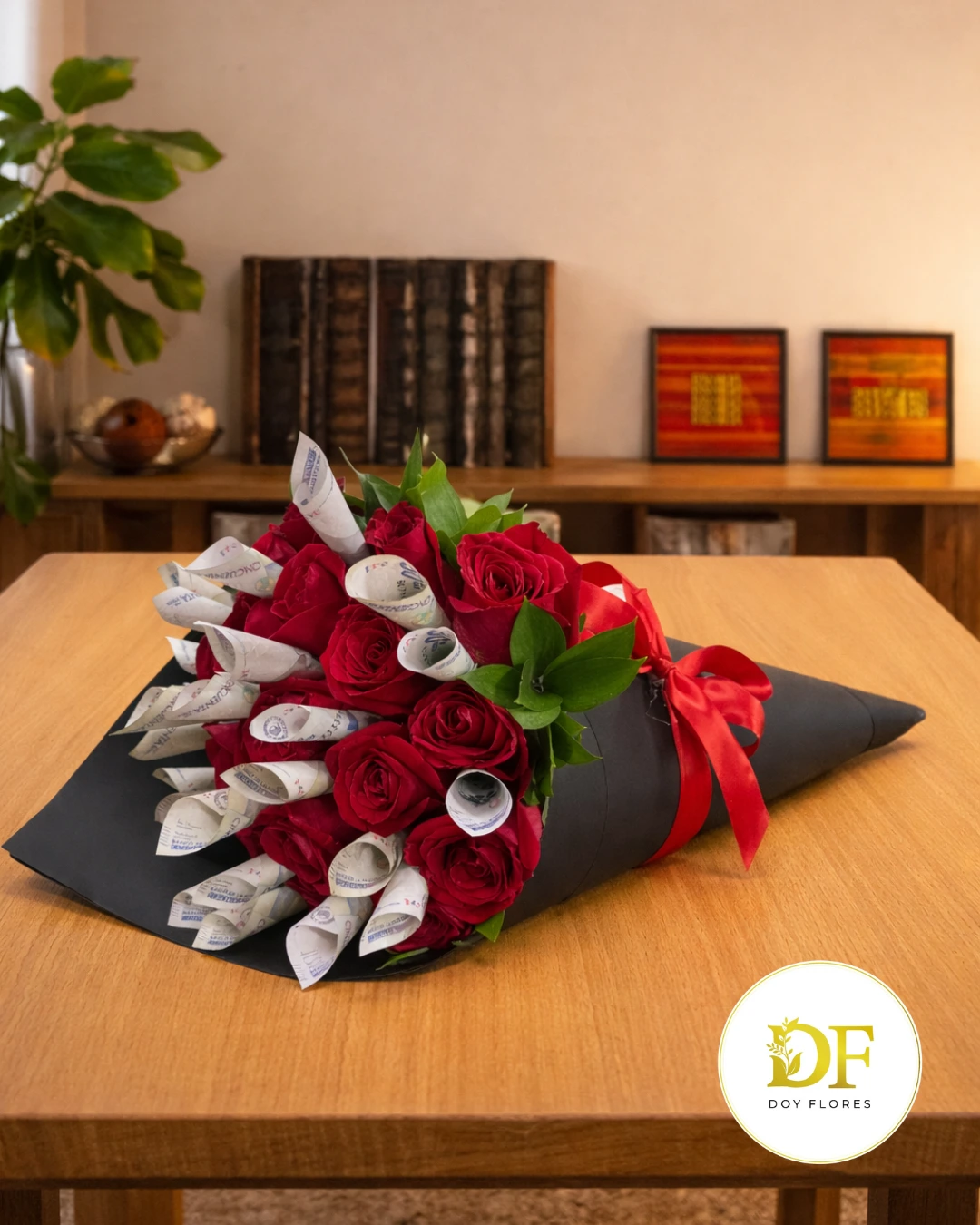 Ramo elaborado con 24 rosas frescas, acompañado de follaje de rusco y un moño decorativo en cinta satín (raso). Presentado en base de papel y cartulina color negro, ideal para expresar amor, elegancia y sentimientos profundos en cualquier ocasión especial.
